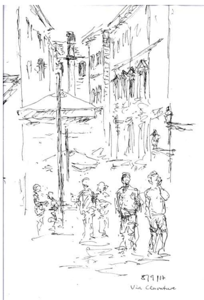 Zu gewinnen gibt es dieses Mal eine Zeichnung, die ich vor einigen Jahren in Bologna gemacht habe. Es ist ein Blick in die ‚Via Clavature‘ – das ist die Straße, wo gern gut gegessen wird.