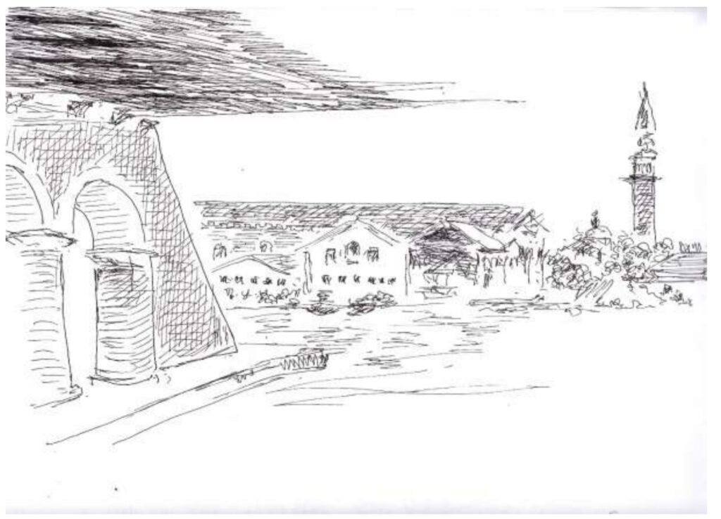 Zu gewinnen gibt es dieses Mal eine Zeichnung, die ich bei der letzten Biennale in Venedig gemacht habe. Neben vielen Ausstellungsorten in der Stadt gibt es vor allem die ‚Giardini‘ – dort sind viele Pavill0ons der Länder – und das ‚Arsenale‘ – das ist die ehemalige Werft, wo früher die Galeeren gebaut wurden. Am Ende dieser riesig großen Fabrik ist ein Hafenbecken, und von dort hat man wieder wunderbare Blicke. Vom Betrachten der Kunst in den Hallen recht erschöpft, habe ich diese Zeichnung gemacht.